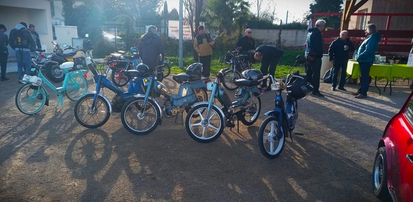 Un petit groupe de passionnés de véhicules anciens (auto et moto) vous accueille autour d'un café.
